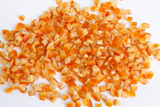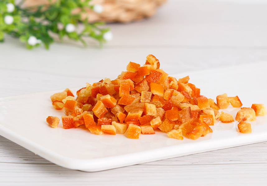 橙皮脯是將冷凍橙皮進行糖漬、干燥、切丁,用于巧克力、面包、蛋糕、華夫餅等的餡料,橙皮脯以其特有的風味廣受烘焙用戶的歡迎。